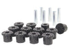 All in one leaf spring bushing service kit covering front and rear eyes of the leaf plus shackle bushings. High kilometres and heavy load carrying causes excessive wear on rubber bushings. Whiteline's signature black bushings are made tough and offer outstanding abrasion resistance, high load bearing capability (4WD's, utes and towing), flexibility, increased tensile strength and chemical resistance to oil, grease, ozone and weathering.