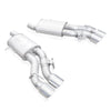 2016-19 Stainless Works, Cadillac CTS-V Sedan exhaust system featuring 3" mandrel bent inlet bends into Dual-Mode Turbo mufflers with 4" diameter quad slash cut tips. Each side is a complete one-piece welded construction including the hangers. Factory Connect Axleback requires cutting of tailpipes in front of factory mufflers and fits to factory exhaust system. Includes functional Dual-Mode Performance valves in the tips which operate in conjunction with Tour and Track modes.