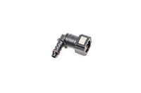 Fitting, 5/16 SAE quick connect female to 3/8in hose barb. 90 degree.